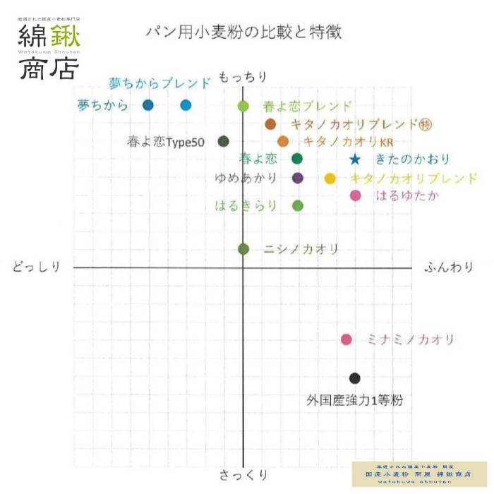 「ゆめちから」と「きたほなみ」をブレンドした北海道産100%使用。強力粉のゆめちからに中力粉のきたほなみをブレンドすることにより生地の安定性に優れハード系から菓子・惣菜パンまで幅広くお使いいただけます。こちらの小麦粉でフランスパンを焼くと外はカリッと中はもちっとした食感が楽しめます。